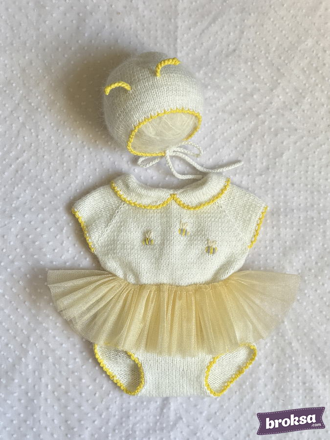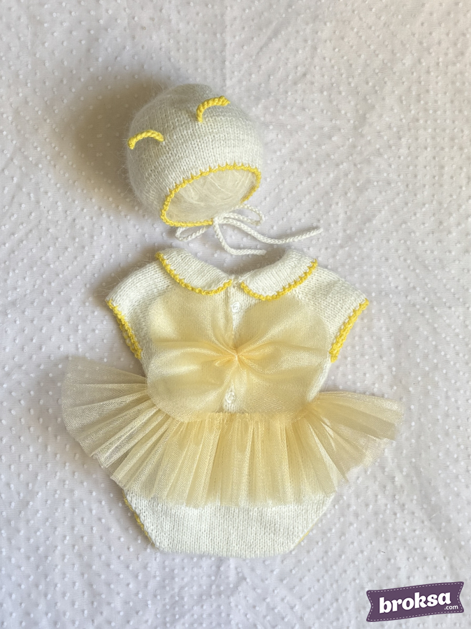 Я створила цей комплект як подих теплого ранку: молочне полотно обіймає шкіру м’якістю, а лимонні відблиски додають світла кожній рисочці малятка. Округлий комірець із жовтою мережаною облямівкою, крихітні вишиті акценти на грудях і повітряна спідничка з ванільного фатину утворюють силует маленької феї. На спинці — крильця із тієї ж невагомої тканини, що перетворює кожен рух на святковий кадр. Пухнастий чепчик з жовтими вусиками та ніжними зав’язками завершує образ — тендітний, сонячний і по-справжньому авторський.