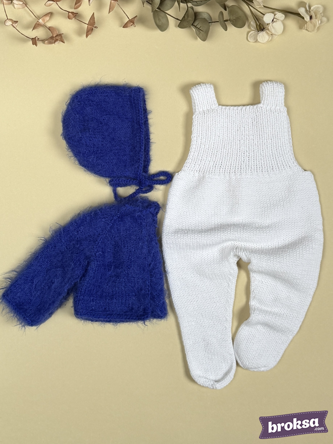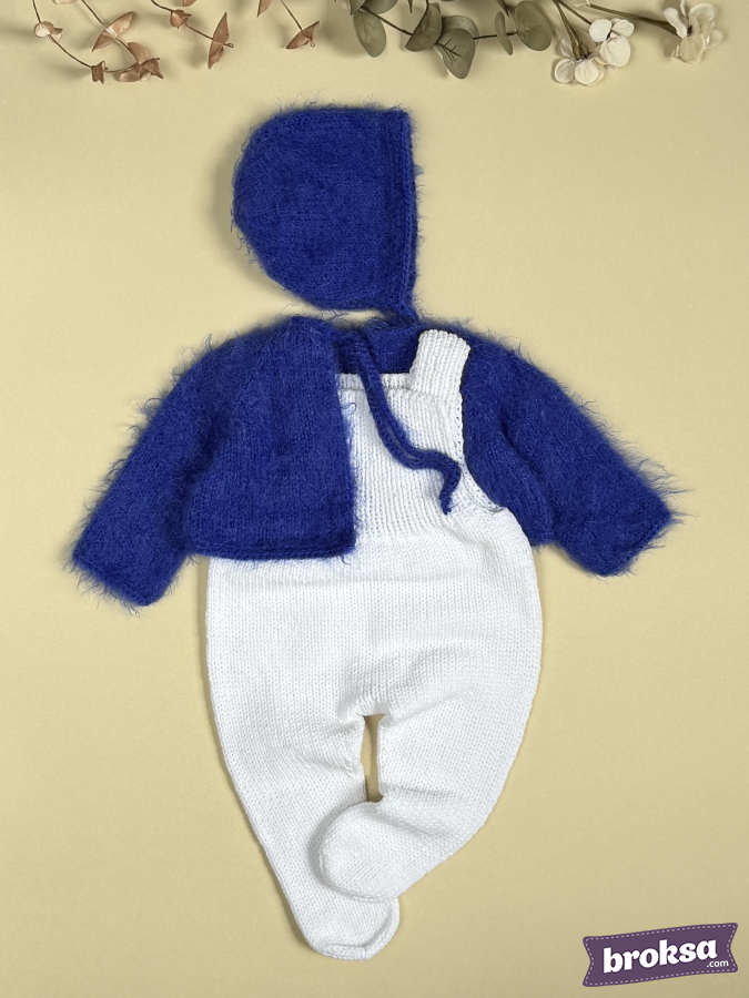 Комплект для ляльки реборн у поєднанні білого та кобальтового. Білий комбінезон зі стопами формує чисту лінію силуету. Пухнастий короткий жакет і чепчик на зав’язках додають м’якість. Матеріали високого ґатунку приємні на дотик, посадка точна і охайна.